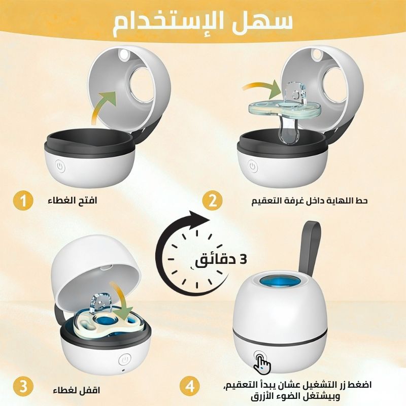 يعقم لهاية طفلك خلال 3 دقائق ويقلل تعرضه للجراثيم والبكتيريا اللي قد تنتقل مباشرة من اللهاية إلى فمه.